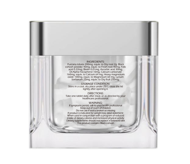 Each tablet delivers a clean, effective blend of Pueraria lobata, Black cohosh powder, Lycium barbarum, Folic acid, Biotin, Ascorbic acid, DL-Alpha-Tocopherol, Calcium carbonate and Heavy magnesium oxide to ensure both safety and reliable support.